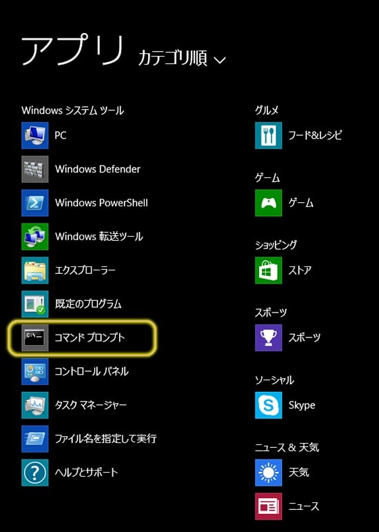 アプリ一覧のシステムツールの中から「コマンドプロンプト」をクリック