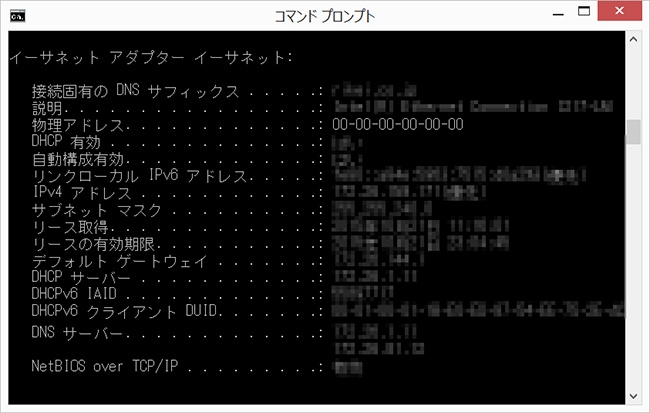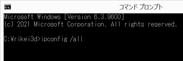 コマンドプロンプト「ipconfig /all」と入力して、Enterキーをクリックして下さい。