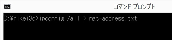 ※上図の場合は、コマンドプロンプトに表示されたフォルダにmac-address.txtという名前のテキストファイルがCドライブのrikei3dフォルダに作成されます。