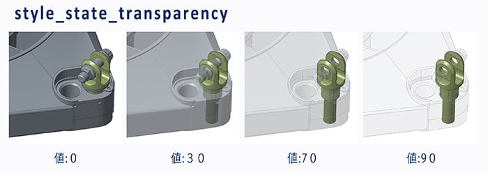 スタイルステートで [透明] に設定されている構成部品の透明度の値を設定します。アセンブリの非アクティブ構成部品の表示にも影響します。