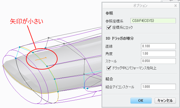 Creo のスタイルフィーチャーのサーフェス接続矢印が小さくて見えにくいので大きくしたい