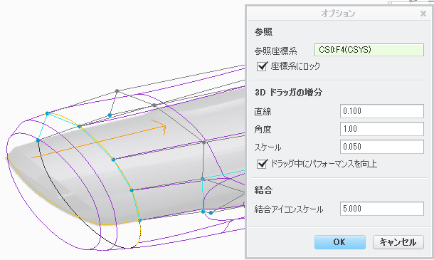 Creo と Pro/ENGINEER のスタイルフィーチャーのサーフェス接続矢印が小さくて見えにくいので大きくしたい。スタイルのプリファレンスから [結合アイコンスケール] の数値を大きくすると矢印が大きくできますが次回起動時に初期値に戻ってしまいます。