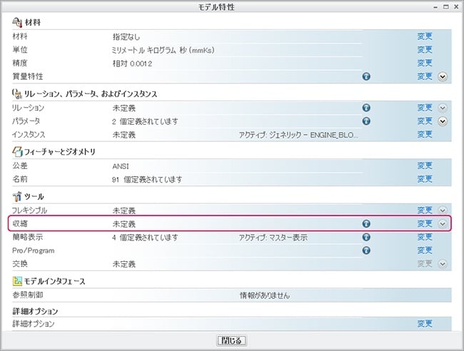 「モデル特性」内の収縮行で「変更」をクリックすると収縮コマンドが実行されます。