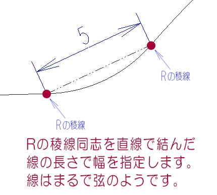 通常のラウンドでは、ラウンド半径の値を入力しますが、[弦]を指定した場合は、以下の図のような幅の値を入力します。