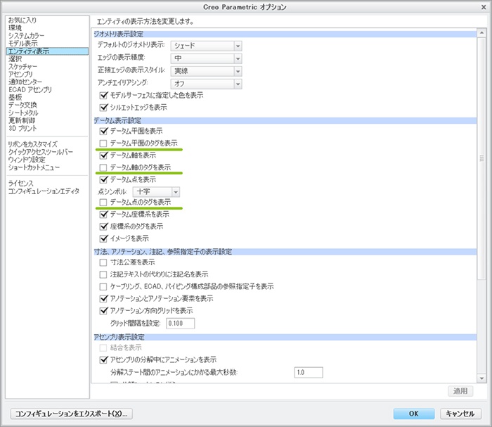1. ファイル>オプション とクリックして表示されるCreoオプションダイアログの「エンティティ表示」カテゴリでタグ表示にチェックを入れます。
