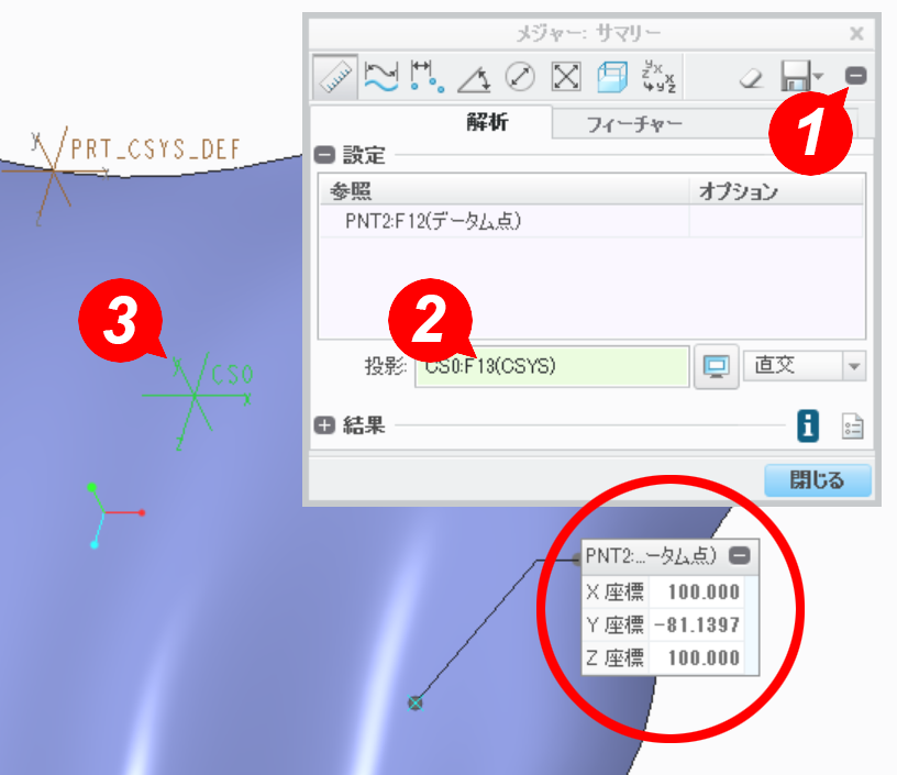Creo 2.0以降の操作は、解析タブ>測定サマリー とクリックして該当するデータム点を選択するだけです。選択後、以下の図のようにデフォルト座標系に対してのX,Y.Zの座標値が表示されます。