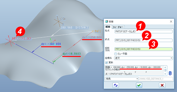 - 距離ダイアログで始点と終点を指示します。今回の場合は、データム点と基準となる座標系です。さらに投影方向として基準になる座標系を指示します。指示を終えるとグラフィックウィンドウと距離ダイアログに座標値が表示されます。