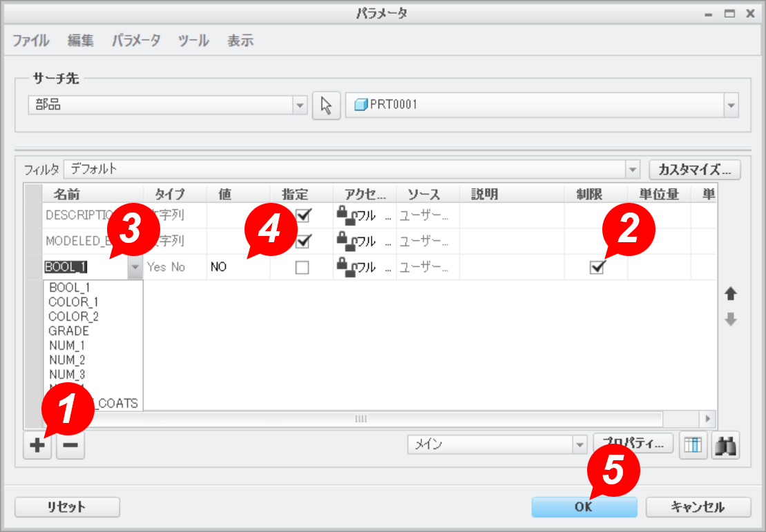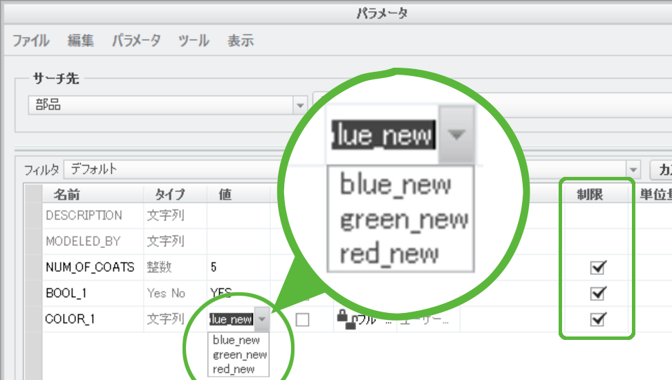 Pro/E、Creo、Windchill、CreoやPro/Eで制限パラメータを利用し値をリストから選択する方法。