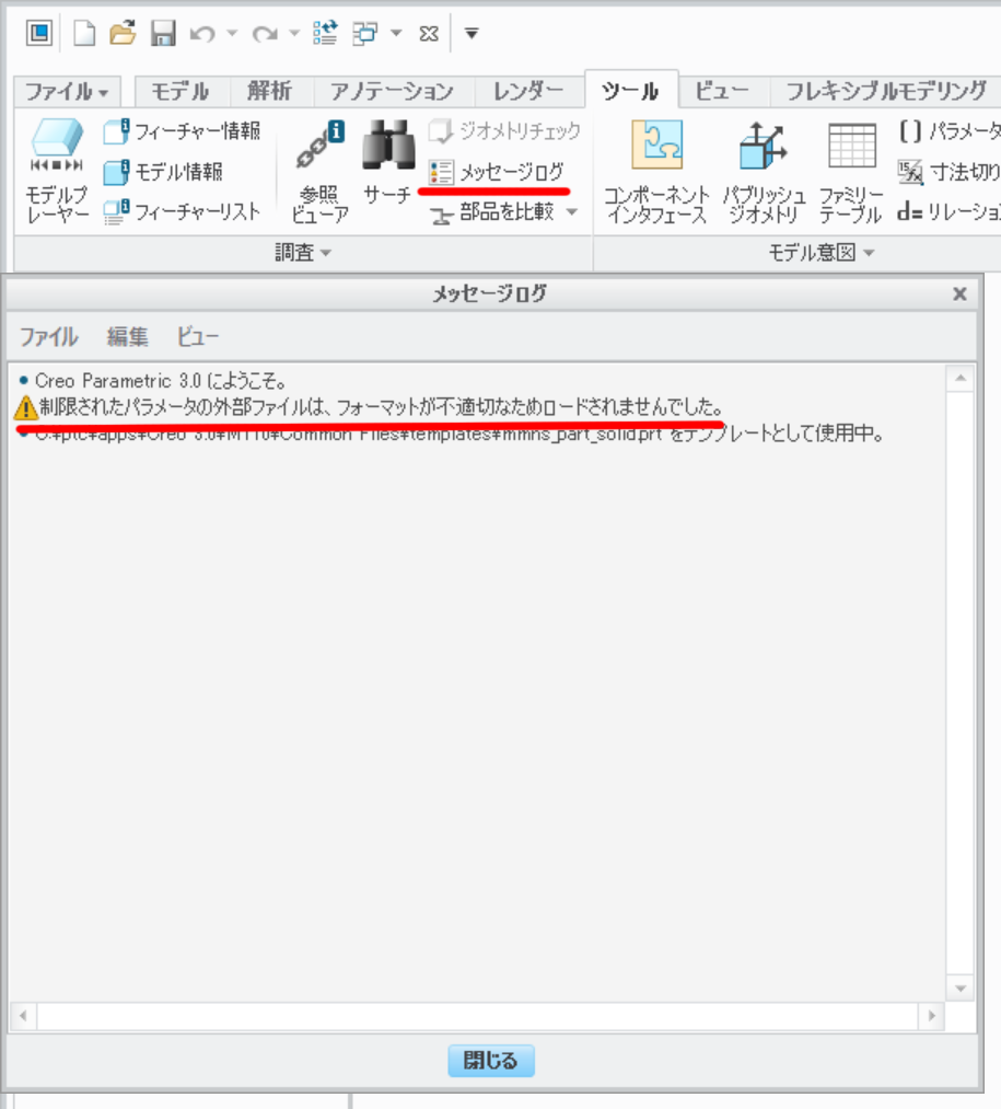 制限のチェックが入れられないときには、メッセージログを確認します。「制限されたパラメータの外部ファイルは、フォーマットが不適切なためロードできませんでした。」とあれば.lstファイルに誤りがありますので修正する必要があります。残念ながらどこが誤りかは知らせてもらえません。自力で捜して修正します。