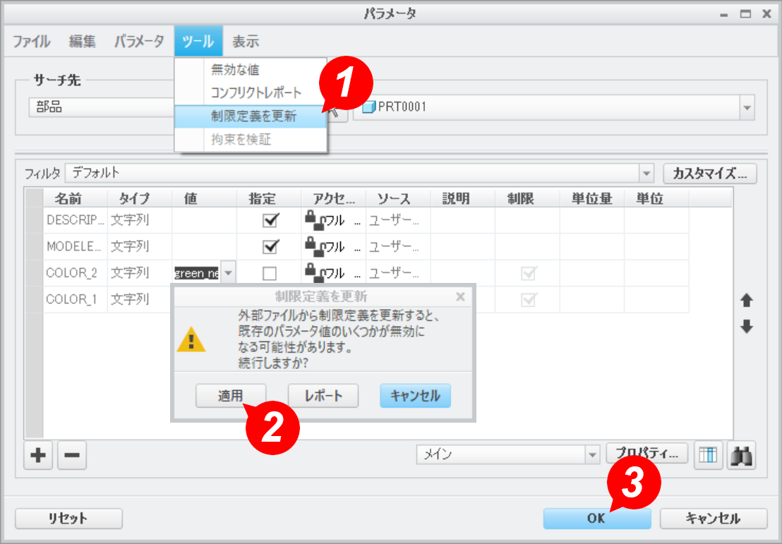 - 制限ファイル(.lst)に変更が加えられたときには、必ずCreoの再起動が必要になります。再起動しない限り、制限ファイルの更新はできません。再起動後にパラメータダイアログで ツール>制限定義を更新>適用 の順にクリックすると変更された制限定義ファイルの値に更新されます。