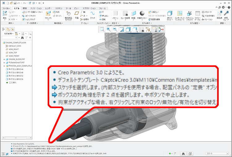 Creo の画面の下にはメッセージ領域があり、システムからのメッセージが表示されます。デフォルトのままだと1行ですが、設定で行数を増やすことができます。