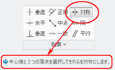 メッセージ領域には、次にユーザーは何を操作しなければならないか表示されることがあります。例えば、スケッチャーの対称拘束を実施しようとしているときには、このようなメッセージが表示されます。
