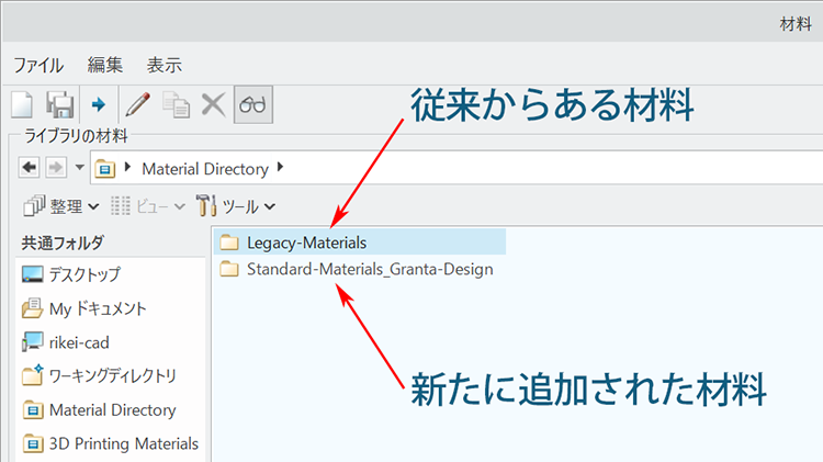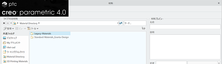 Creo 4.0では3.0以前と同様の方法で材料ダイアログを表示できますが、デフォルトの設定で表示された材料ダイアログにはLegacy-MaterialsとStandard-Materials_Granta-Designの2つのフォルダがあります。