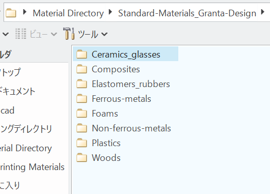 Standard-Materials_Granta-Designフォルダをオープンすると、さらにフォルダに分別された材料が用意されています。