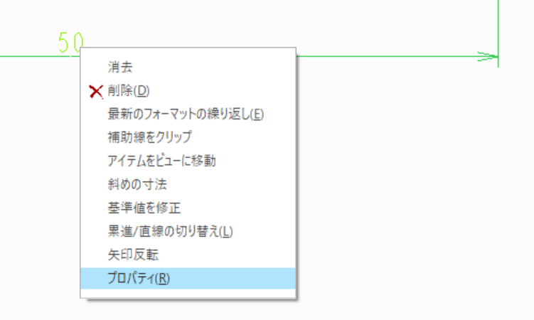 - 寸法を選択し、右ボタンを長押しで表示されるショートカットメニューから「プロパティ」を選択します。