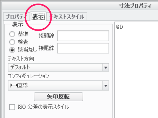 - 寸法プロパティダイアログの「表示」タブを選択します。