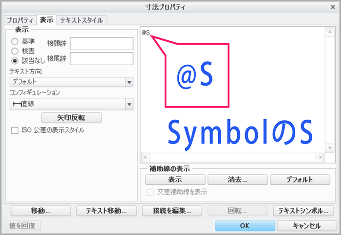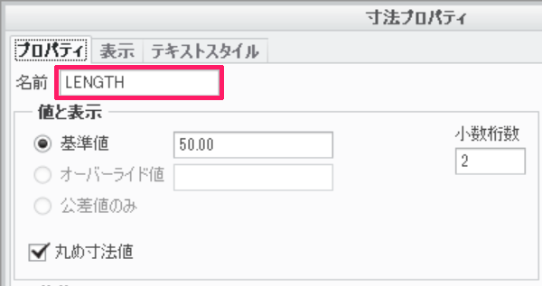 - 表示される寸法名は、寸法プロパティダイアログから変更可能です。