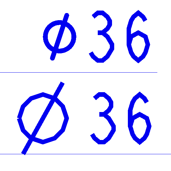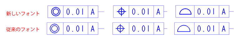 拡大してみると見た目が完全に異なります。上は新しいTrueTypeフォントなので非常に滑らかですが、従来のフォントはラインフォントなので多角形になっています。