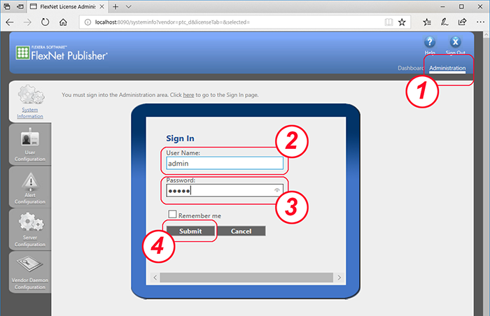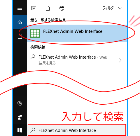 - 「スタートメニュー」や「プログラムとファイルの検索」からFLEXnet Admin Web Interfaceを検索して開きます。