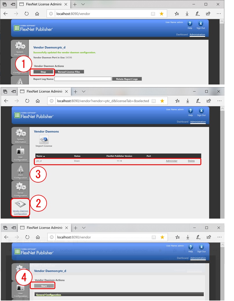 再起動は、ptc_dの詳細で、「Stop」ボタンをクリックし、「Vendor daemon Configuration」タブを選択してptc_dの行を選択し「Start」ボタンをクリックしします。