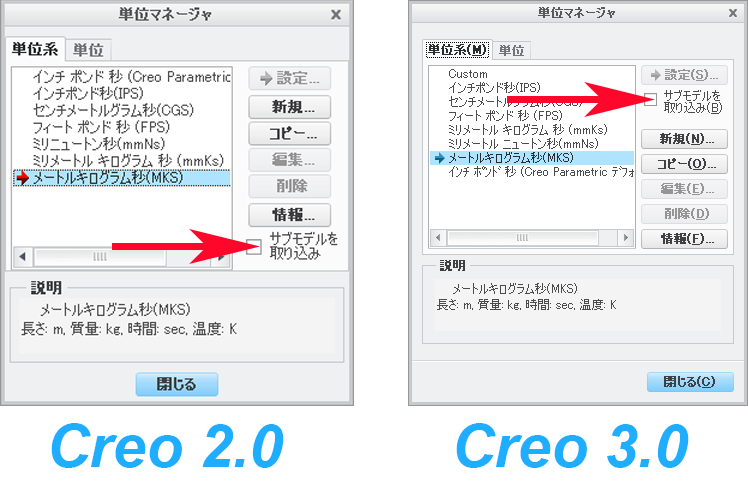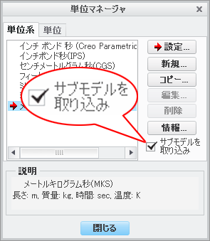 Creo 2.0 M070以降のリリースでは、単位を変更する単位マネージャーダイアログに「サブモデルを取り込み」のチェックボックスが追加されました。このチェックを入れて単位を変更すると、アセンブリだけでなく、その構成部品の単位系も変更することができます。