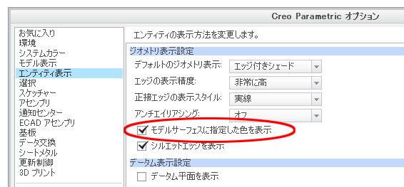 - エンティティ表示カテゴリを選択して、ジオメトリ表示設定内の「モデルサーフェスに指定した色を表示」のチェックで制御します。