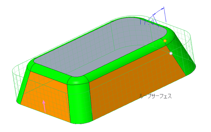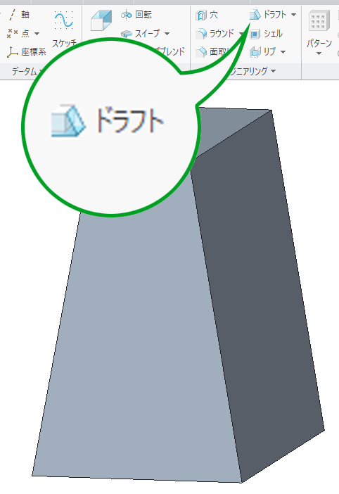 下の図は、ドラフト面の上部までラウンドが付いています。Creo 5.0ではこのような形状に対してもドラフトが作成できます。