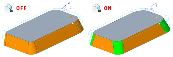 このオプションを使用すると、ドラフトサーフェスに属するラウンドサーフェスをドラフトから外します。下図を見ると、OFFの状態ではラウンドサーフェスがドラフトされているため上に向かってラウンドサーフェスの円弧が小さくなっています。対してONの状態ではラウンド半径を維持するようになります。ドラフトから除外されているサーフェスは異なる色で表示されます。