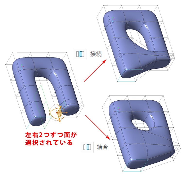 2つ以上の偶数個の面を選択し、結合を実行すると片側の面のエッジにもう一方のエッジが移動して面が作成されます。また選択する順序が重要です。最初に選択した面がマスター面になり、次に選択した面が移動する面になります。