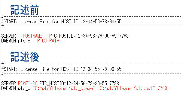 1. 名前を変更した license.dat をメモ帳などのテキストエディタで開きます。ライセンスサーバーのPC名、ptc_d.exe、ptc.optのパス、ptc_dの使用するポート番号を記述します。