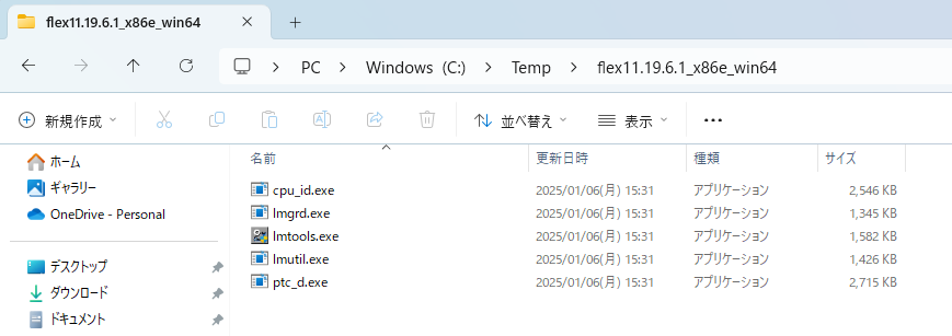 解凍したプログラム(cpu_id.exe / lmgrd.exe / lmtools.exe / lmutil.exe / ptc_d.exe)を下記フォルダにコピーします。