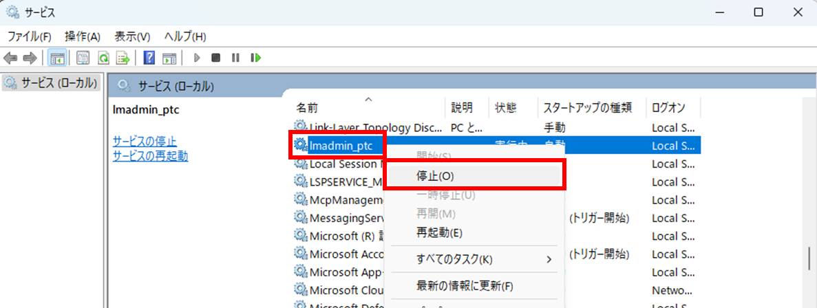 サービス管理画面を表示しサービス「lmadmin_ptc」を右クリックし「停止」を選択します。