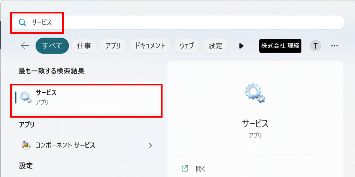 サービス一覧画面を表示します。スタートメニューの「プログラムをファイルの検索」欄に「サービス」と入力すると素早くアクセスできます。