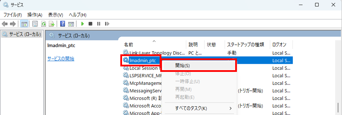 サービス管理画面を表示し、サービス「lmadmin_ptc」を右クリックし「開始」を選択します。