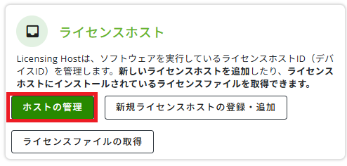 - 「ライセンス操作」より「ライセンスホスト」の「ホストの管理」をクリックします。