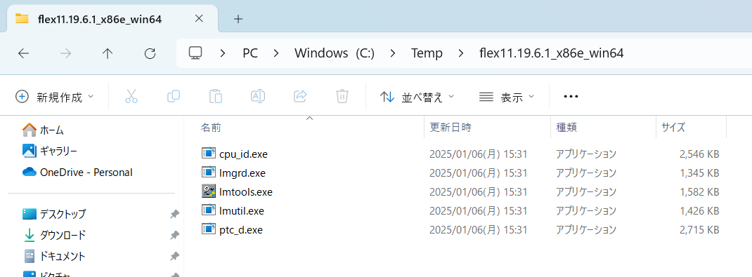 ダウンロードが完了したらzipファイルの中身を任意のフォルダにコピーします。下の例では「C:\Temp\flex11.19.6.1_x86e_win64」フォルダにコピーされています。
