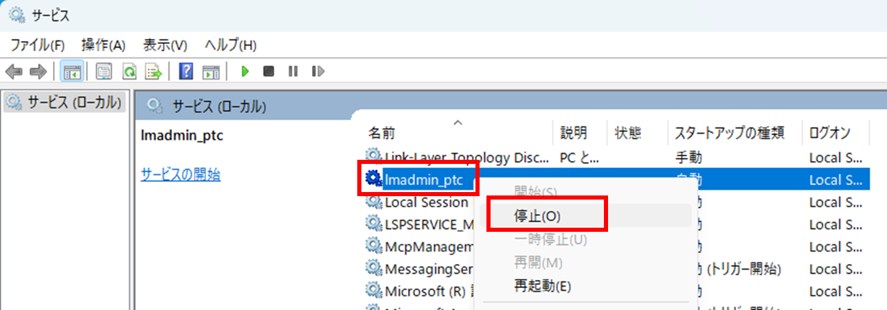 Windowsサービスを起動し、「lmadmin_ptc」を停止します。