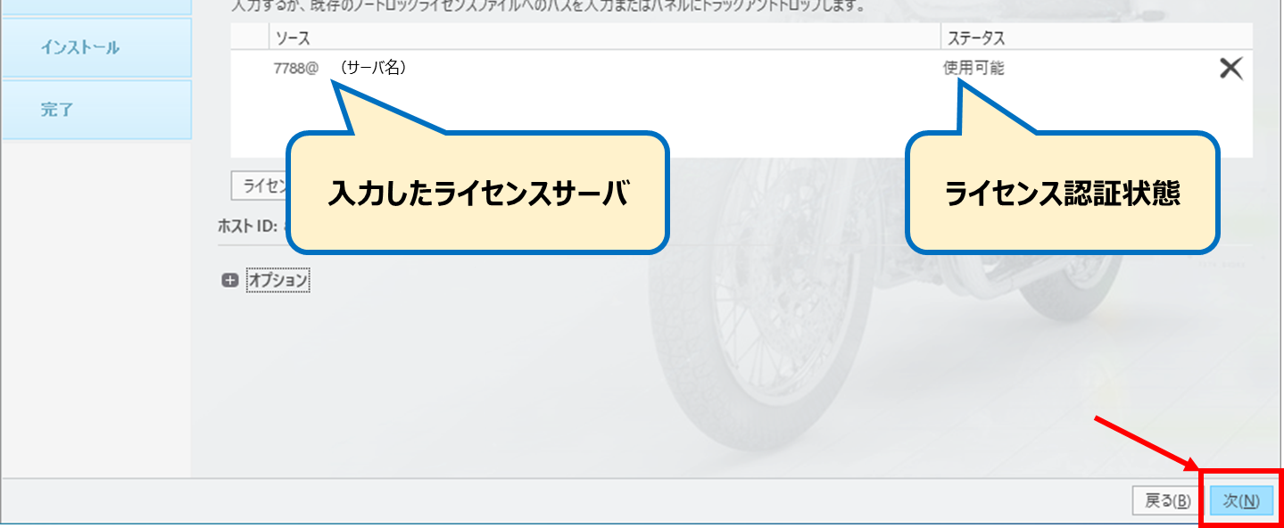7788@ライセンスサーバーの名前 を入力してステータスが「使用可能」になったら「次」ボタンをクリックします。