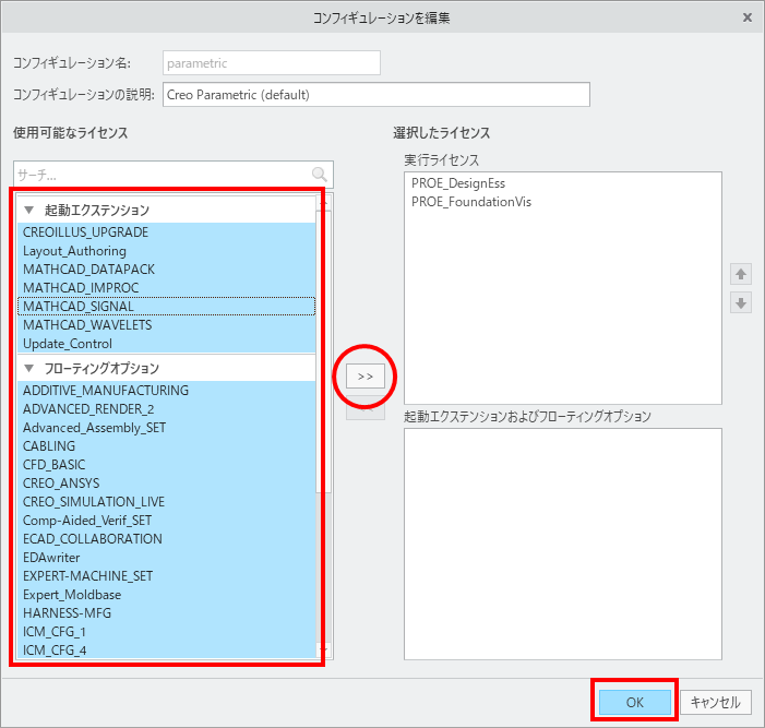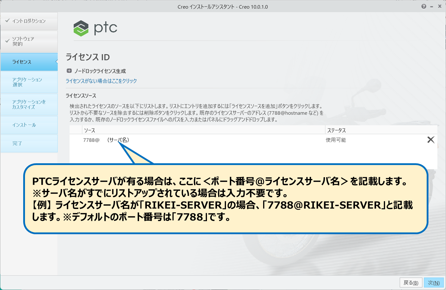 またCreoを新規にインストールする際にライセンスファイルがある場合、「ソース」の欄にライセンスファイルをドラッグ&ドロップします。