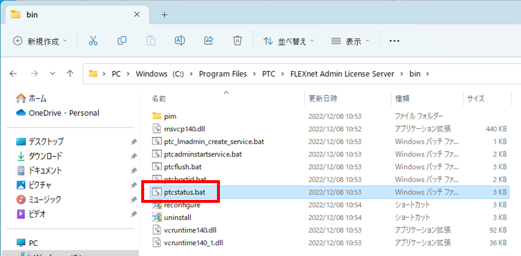 - 下記フォルダの「ptcstatus.bat」ファイルをダブルクリックします。
