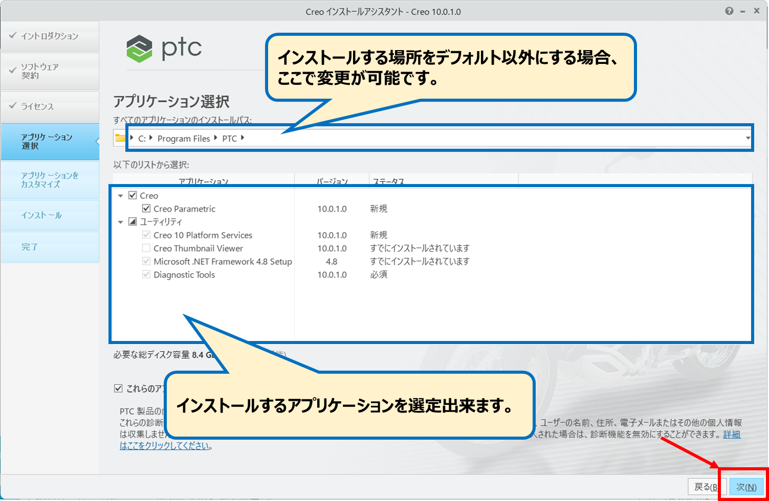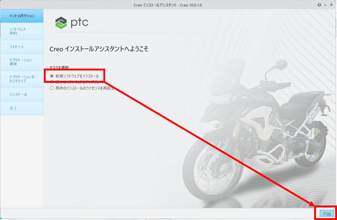 - 「PTCインストールアシスタントへようこそ」画面で「新規ソフトウェアをインストール」にチェック後「次」ボタンをクリックします。