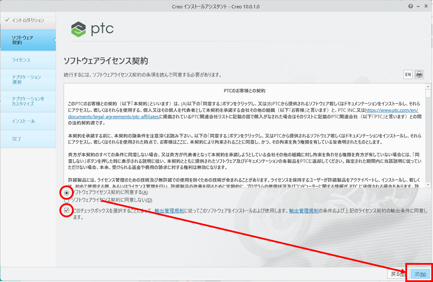 - 「ソフトウェアライセンス契約」画面にて2箇所の同意欄にチェックを入れて「次」ボタンをクリックします。