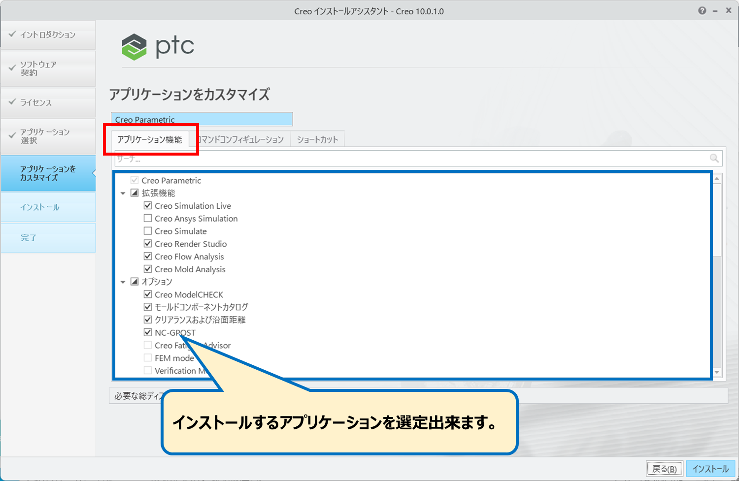 - つぎに「アプリケーションをカスタマイズ」が表示されます。「アプリケーション機能」タブでは、実施するアプリケーションを選択します。