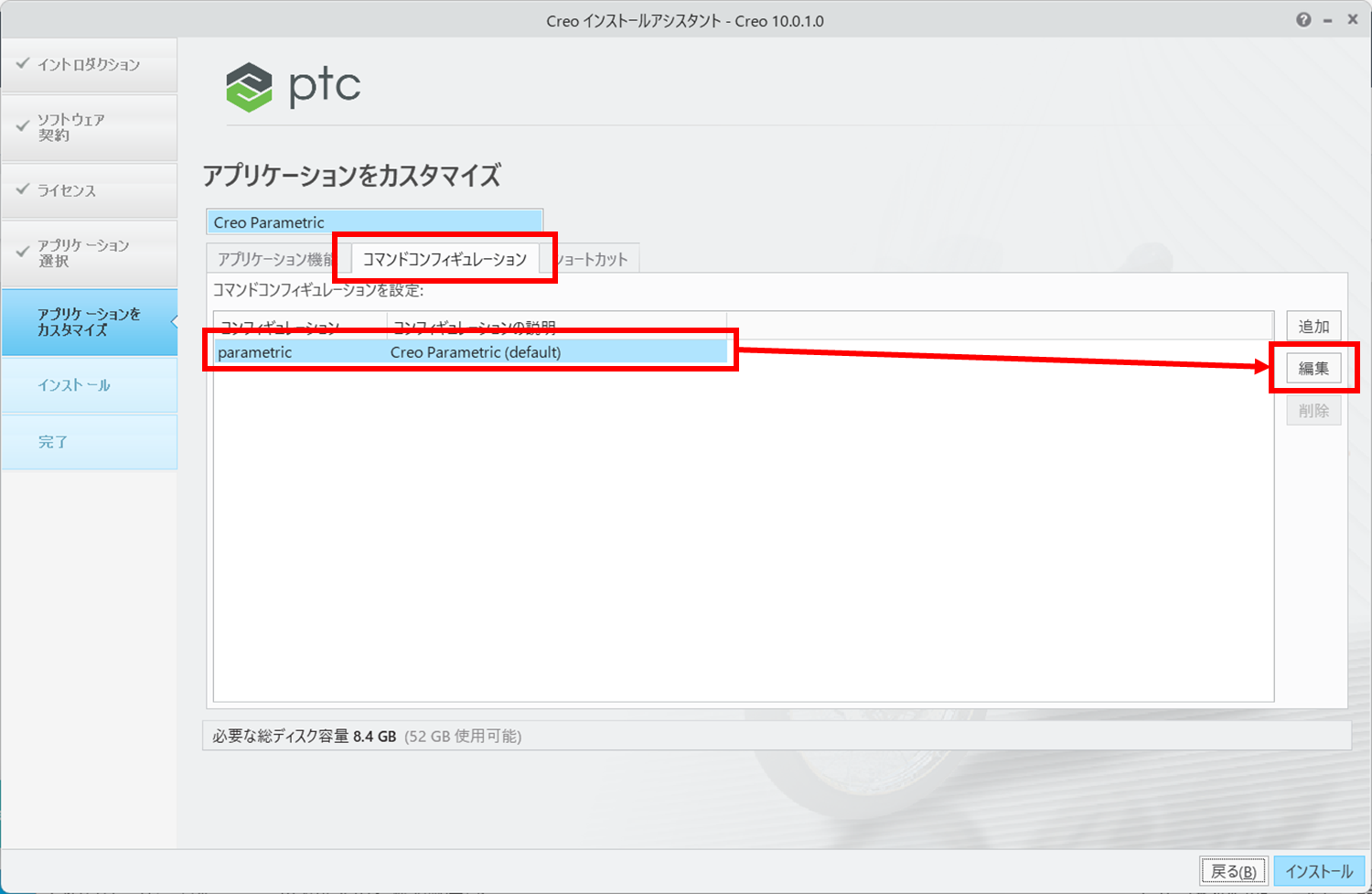 「コマンドコンフィギュレーション」タブを表示します。リストから parametric を選択して、「編集」ボタンをクリックします。
