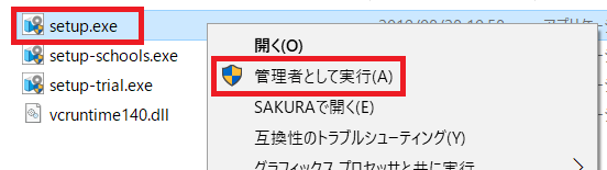 - ダウンロードしたメディアまたはDVDメディアから「setup.exe」を右クリックして管理者として実行します。(Windowsから変更を許可するダイアログが表示されたらOKを押して許可します)