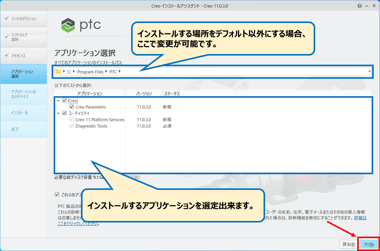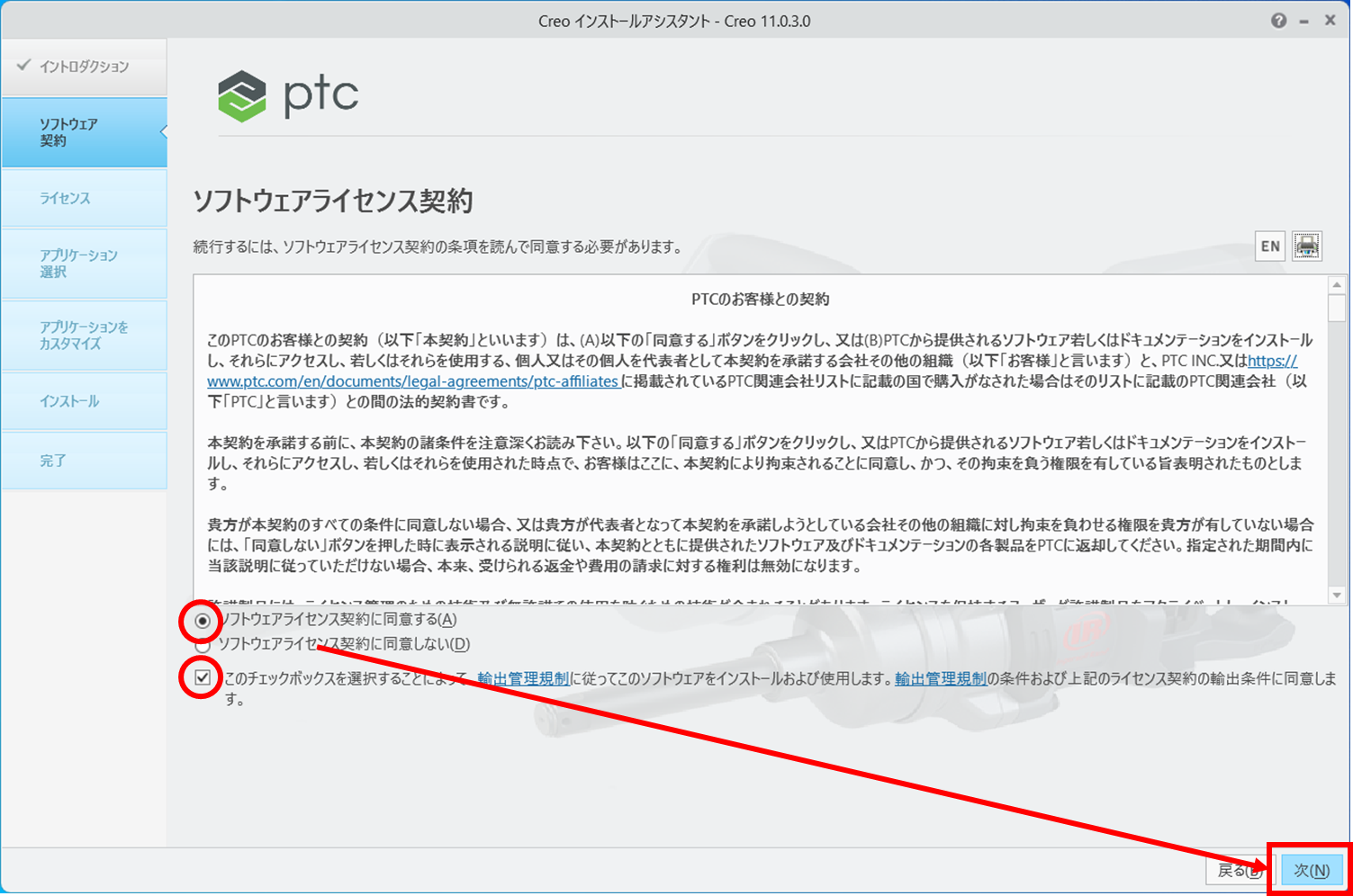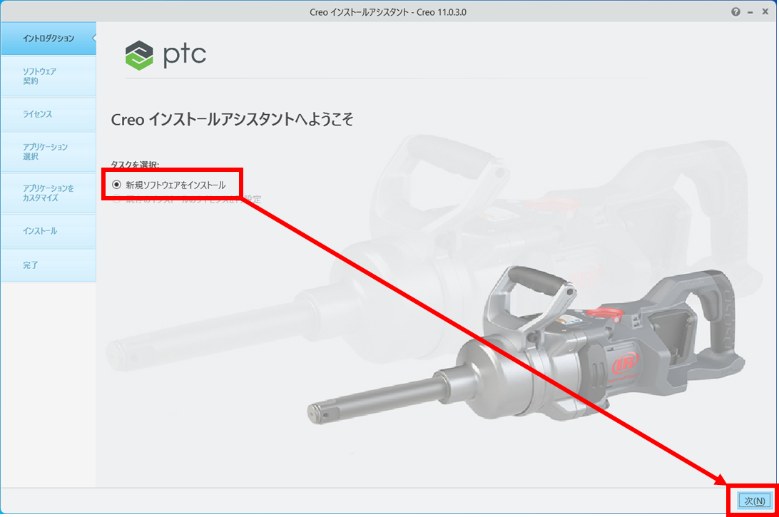 - 「PTCインストールアシスタントへようこそ」画面で「新規ソフトウェアをインストール」にチェック後「次」ボタンをクリックします。