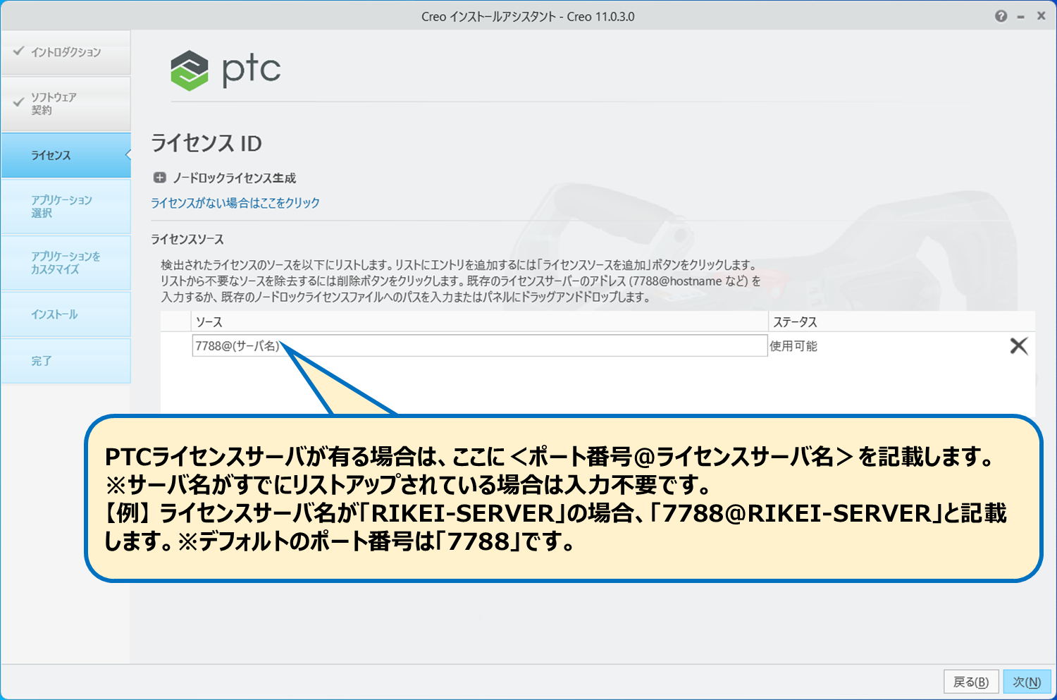 7788@ライセンスサーバーの名前 を入力してステータスが「使用可能」になったら「次」ボタンをクリックします。