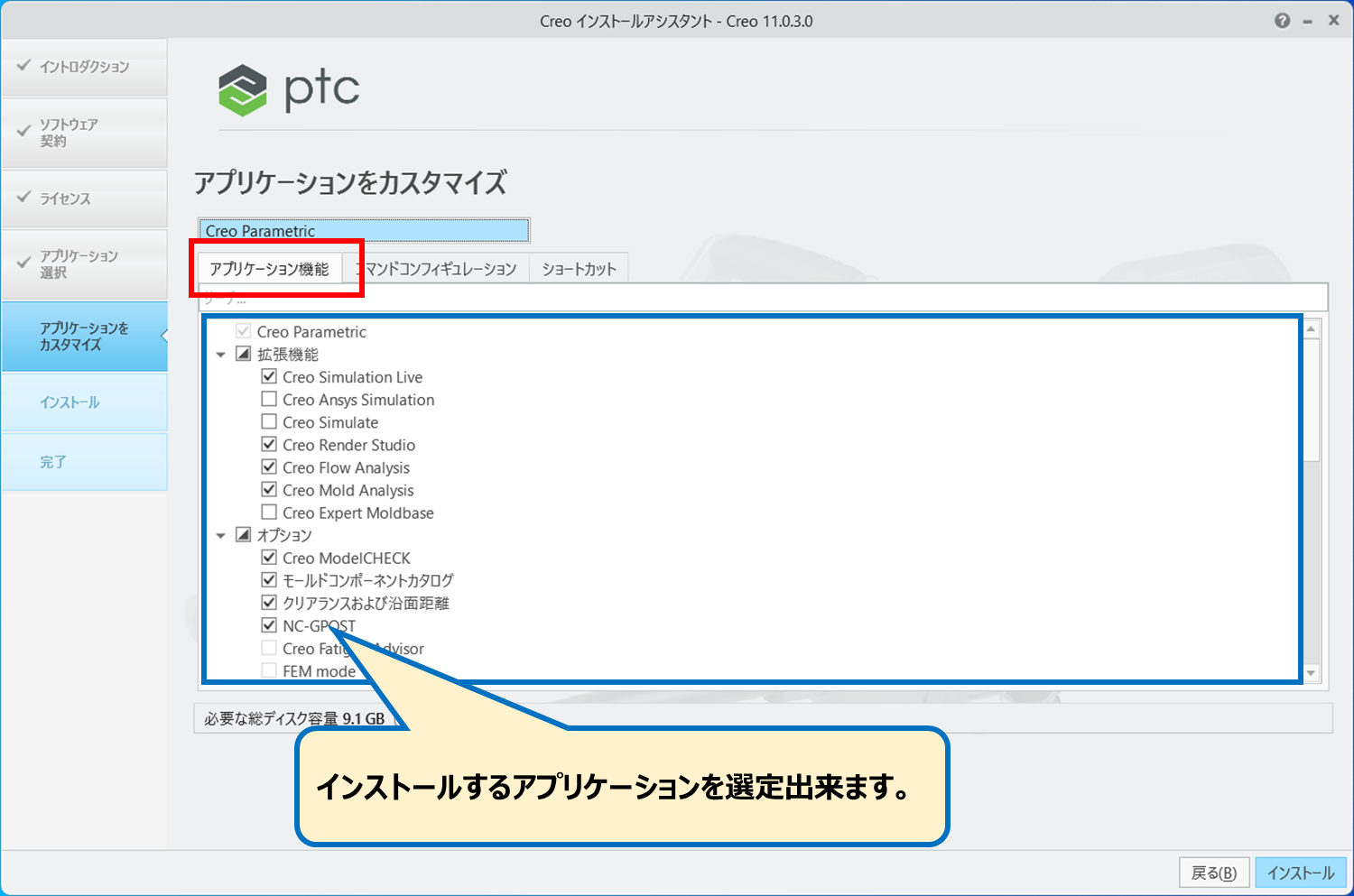 - つぎに「アプリケーションをカスタマイズ」が表示されます。「アプリケーション機能」タブでは、実施するアプリケーションを選択します。