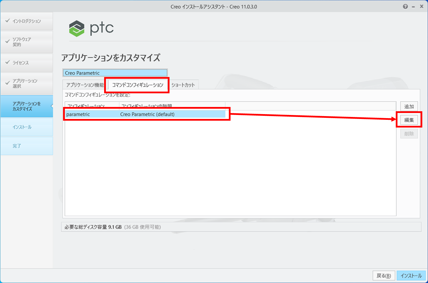 「コマンドコンフィギュレーション」タブを表示します。リストから parametric を選択して、「編集」ボタンをクリックします。