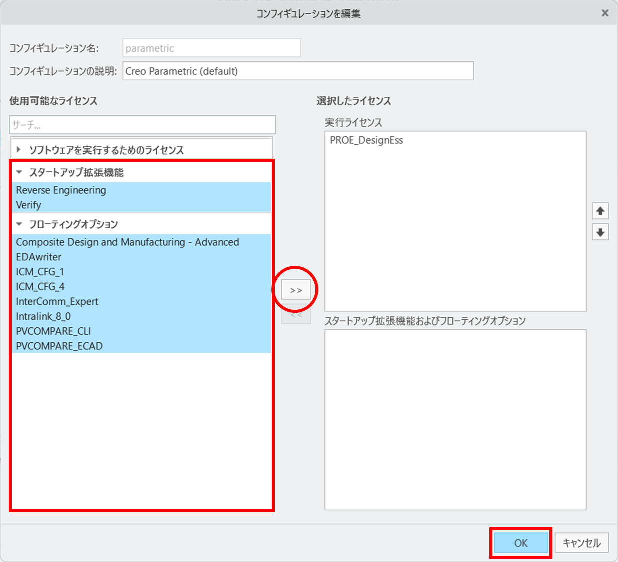 もし使用可能なライセンスという項目にライセンスがあれば選択して、右矢印アイコンをクリックして選択したライセンスに移動します。移動後「OK」ボタンを押して「インストール」ボタンをクリックします。